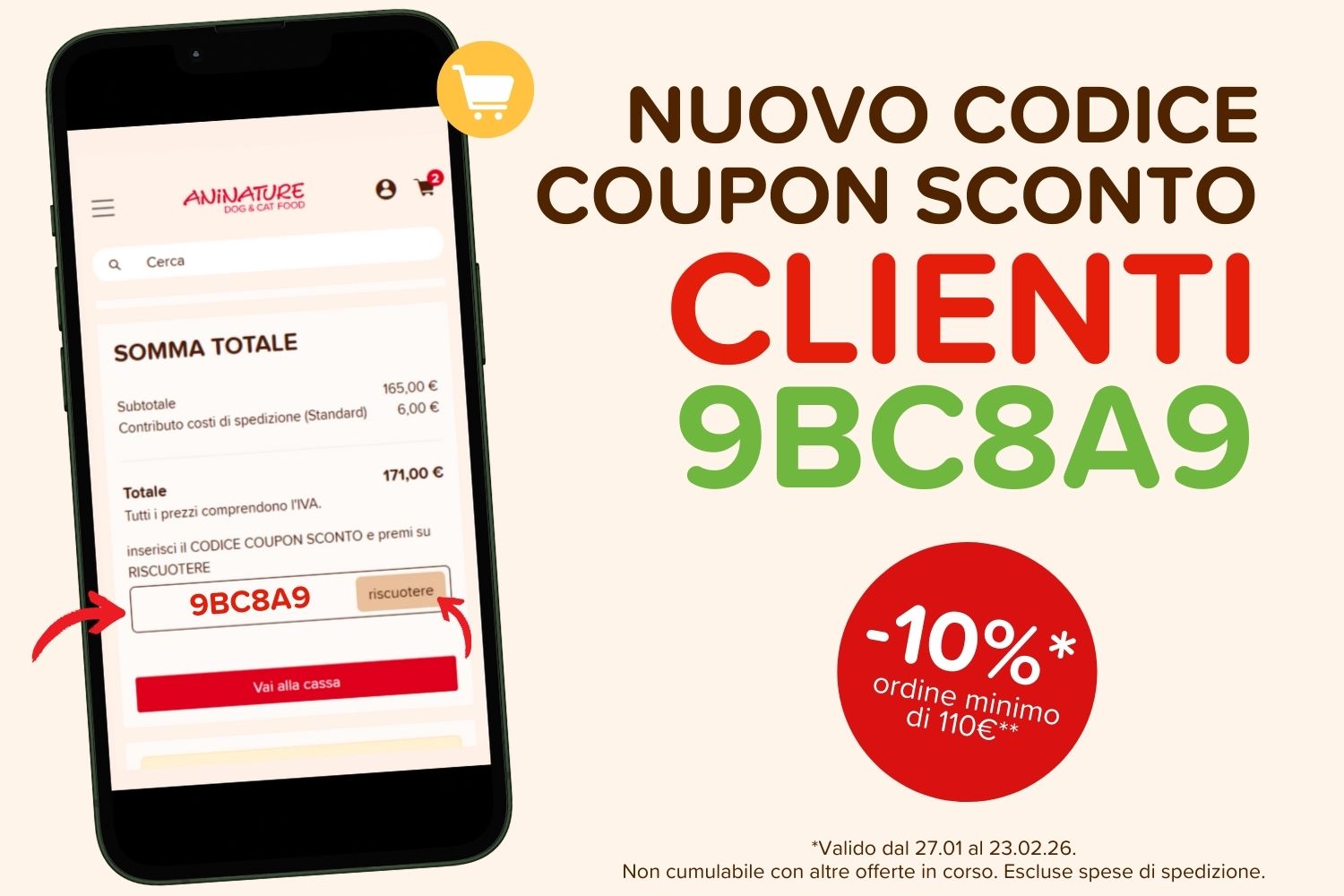 COUPON SCONTO PER I CLIENTI ANiNATURE! In questo periodo per te un COUPON SPECIALE che dà diritto ad uno SCONTO del 10%* su una Spesa Minima di 110€**. Semplice da utilizzare: riempi il carrello con i prodotti che desideri, Inserisci il Codice Coupon prima di andare alla cassa e clicca "riscuotere" per ricevere lo sconto immediato del 10%*! Utilizzabile per un unico ordine nel periodo indicato. *Non cumulabile con altre promozioni in corso e con i prodotti già in offerta o a prezzo speciale come i formati multipli convenienza 2x10kg, 2x5kg, 3x2kg, 3x3kg, 10x80gr . **Escluse spese di spedizione. Iscriviti alla nostra Newsletter per restare aggiornato su tutte le offerte che dedichiamo ai nostri Clienti!
