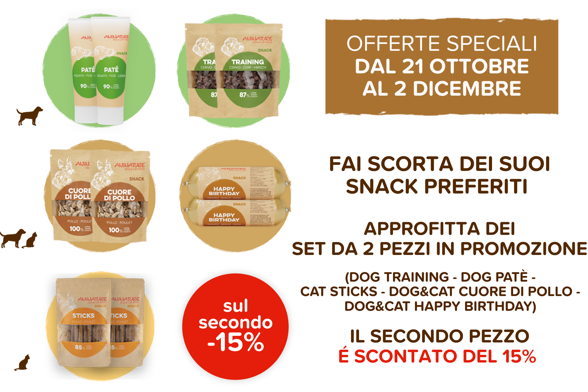 Scopri la nuova promozione dedicata ai nostri Snacks: 5 set pensati per il benessere e il gusto del tuo pet. Ogni set unisce due snack naturali e deliziosi, realizzati con ingredienti selezionati e senza compromessi sulla qualità. E in più, il secondo prodotto è scontato del 15%! Un piccolo gesto per premiare il tuo amico a quattro zampe… e te. Offerta attiva e valida dal 21.10 h14:30 a lunedì 2.12 h24:00. Per ordini Clienti e Consulenti effettuati sul sito aninature.it. Fino ad esaurimento scorte. Non cumulabili con altre promozioni in corso e con i prodotti già in offerta o a prezzo speciale come i formati multipli convenienza 2x10kg, 2x5kg, 3x2kg, 3x3kg, 10x80gr.