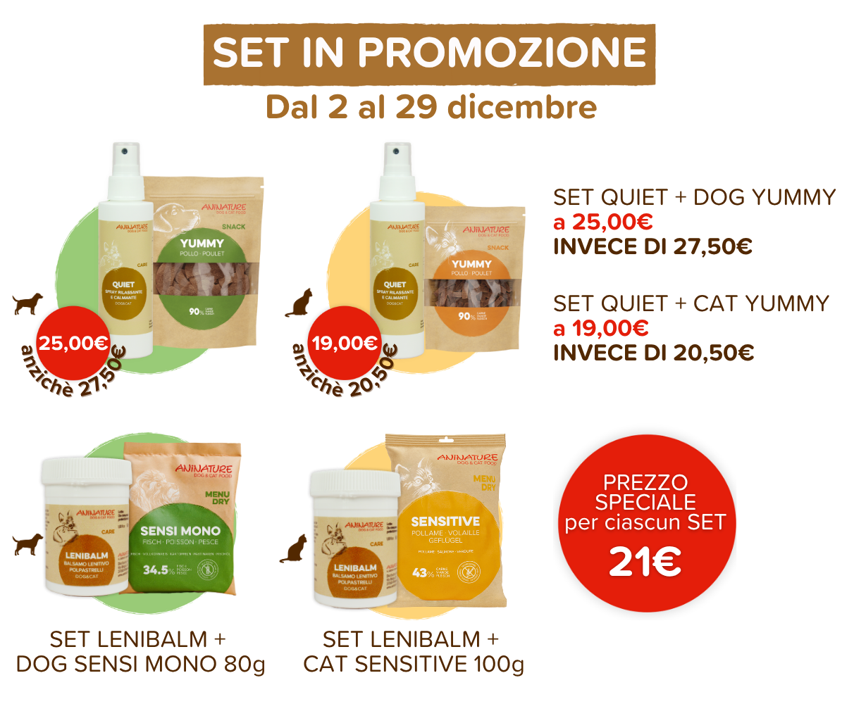 Con l’inverno arrivano anche freddo e aria secca, e con loro le piccole fastidiose conseguenze sulla pelle: screpolature ai polpastrelli, arrossamenti e irritazioni. È proprio in questa stagione che LENIBALM diventa un alleato indispensabile: il balsamo lenitivo che nutre, protegge e dona sollievo alla cute di cani e gatti. Per tutto dicembre puoi approfittare dei SET LENIBALM per cane o per gatto al prezzo speciale di 21€, completi di una confezione di cibo secco: un gesto semplice che si prende cura del loro benessere dal musetto alle zampette. Ma dicembre non è solo freddo: è anche un mese ricco di stimoli, cambiamenti, ospiti, festeggiamenti… e i nostri pet possono risentirne, vivendo momenti di stress o agitazione. In queste situazioni, QUIET diventa un supporto naturale prezioso per aiutarli a ritrovare serenità. Per questo lo abbiamo abbinato in promozione agli Snack Yummy Cat e Yummy Dog, per unire rilassamento e gratificazione in un unico gesto. Un binomio pensato per accompagnare cani e gatti nell’affrontare ciò che li mette in tensione, con dolcezza e benessere. Offerte valide da martedì 02.12 h14:30 a lunedì 29.12 h24:00, per ordini Clienti e Consulenti effettuati sul sito aninature.it, solo sui prodotti e formati indicati nella promozione. Le promozioni potranno essere modificate o sospese in caso di esaurimento scorte o aggiornamenti commerciali.