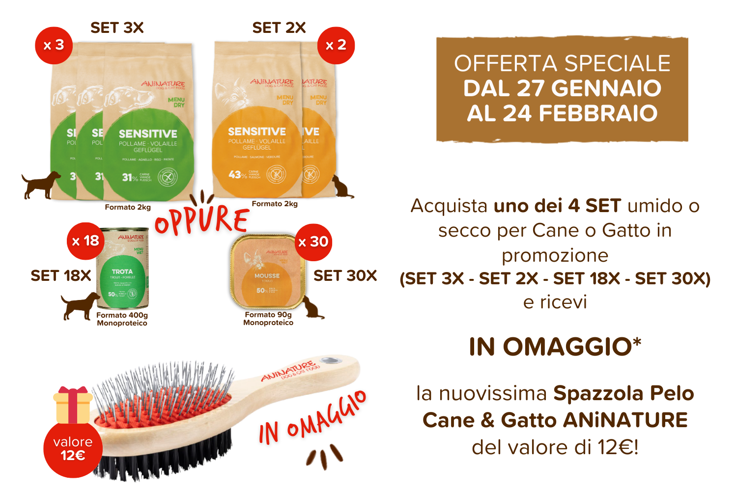 Nutri con amore, cura con un gesto in più. Dal 27 Gennaio h14:30 al 24 Febbraio h11:30, acquista uno dei 4 SET in promozione di umido o secco per Cane o Gatto: • SET 3X Dog Sensitive 2kg + Spazzola > 94,50€ • SET 2X Cat Sensitive 2Kg + Spazzola > 81,00€ • SET 18X Dog Trota monoproteico 400g + Spazzola > 90,00€ • SET 30X Cat Tonno monoproteico 90g + Spazzola > 90,00€ e ricevi IN OMAGGIO* la nuovissima Spazzola pulizia pelo per Cane e per Gatto ANiNATURE, del valore di 12€. La spazzolatura è uno di quei gesti che non richiedono tempo in più ma presenza: ✔ aiuta a eliminare il pelo in eccesso ✔ stimola la cute in modo delicato ✔ rafforza la relazione ✔ è adatta sia a cani che a gatti Un gesto semplice che potenzia gli effetti di un’alimentazione naturale e di alta qualità. I nostri SET sono pensati per semplificare la quotidianità, senza rinunciare alla qualità. Ricette sane e nutrienti, ingredienti selezionati e tutto il rispetto che meritano. Offerte valide da martedì 27.1 h14:30 a martedì 24.2 h11:30, per ordini Clienti e Consulenti effettuati sul sito aninature.it, solo sui prodotti e formati indicati nella promozione. Le promozioni potranno essere modificate o sospese in caso di esaurimento scorte o aggiornamenti commerciali.