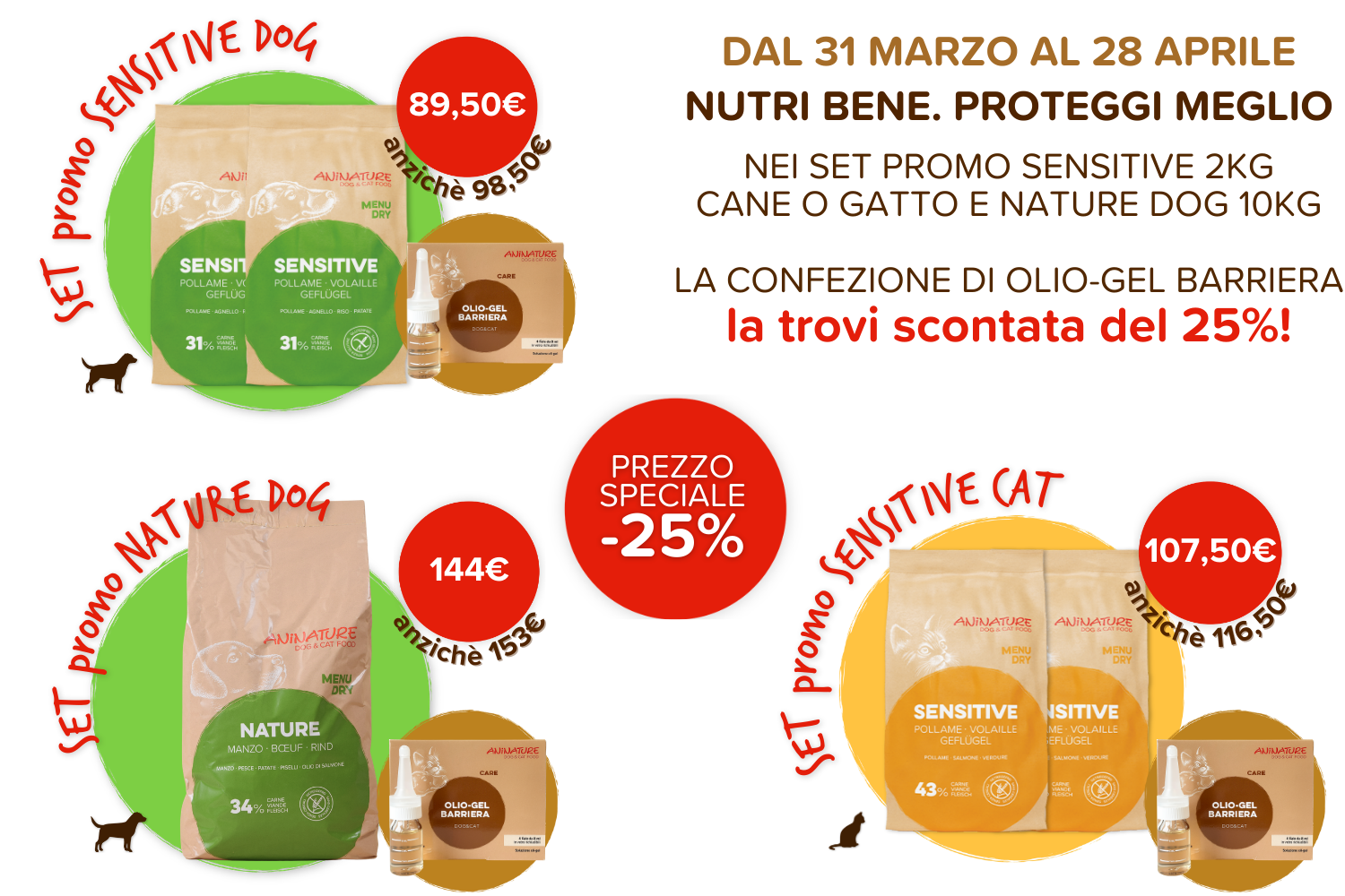 Con l’arrivo della primavera aumentano le occasioni per stare all’aria aperta con i nostri animali, ma anche il rischio di incontrare parassiti. Per questo abbiamo creato 3 nuovi set promozionali dedicati a cane e gatto, che uniscono nutrizione di qualità e protezione naturale. In ogni set trovi i nostri alimenti Sensitive o Nature abbinati all’Olio-Gel Barriera, formulato per aiutare a proteggere il tuo animale in modo naturale. E per rendere la scelta ancora più conveniente, la confezione di Olio-Gel Barriera è scontata del 25%. Scopri i set disponibili: SET PROMO SENSITIVE DOG 2 confezioni da 2 kg + Olio-Gel Barriera 89,50€ invece di 98,50€ SET PROMO NATURE DOG 1 confezione da 10 kg + Olio-Gel Barriera 144€ invece di 153€ SET PROMO SENSITIVE CAT 2 confezioni da 2 kg + Olio-Gel Barriera 107,50€ invece di 116,50€ Una soluzione semplice e conveniente per nutrire bene e proteggere meglio i tuoi animali durante tutta la stagione.