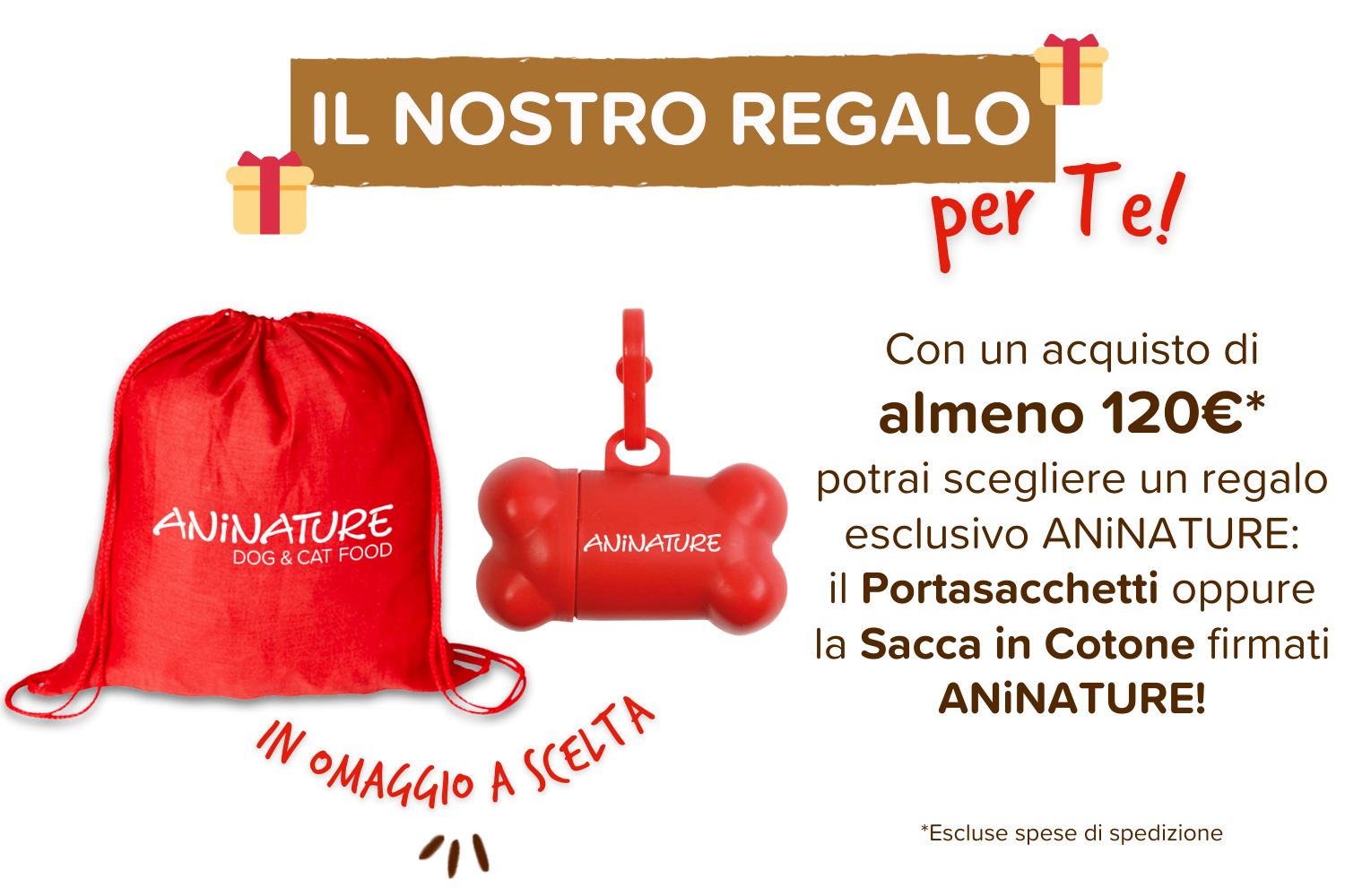 Dal 16 al 29 dicembre, ogni ordine di almeno 120€* ti dà accesso ad un regalo esclusivo firmato ANiNATURE! Puoi scegliere tra: - Portasacchetti ANiNATURE – ideale per le passeggiate quotidiane, comodo e sempre a portata di zampa. - Sacca in cotone ANiNATURE – pratica e perfetta per portare con te tutto ciò che ami. Un piccolo pensiero per ringraziarti della fiducia e per accompagnarti, ogni giorno, con un accessorio utile e 100% stile Aninature. *Promozione valida dal 16.12 h 00:01 a lunedì 29.12 h 23:59 sul sito www.aninature.it s per ogni ordine di almeno 120€. La promozione potrà essere modificata o sospesa in caso di esaurimento scorte o aggiornamenti commerciali. La soglia di spesa si intende escluse le spese di spedizione.